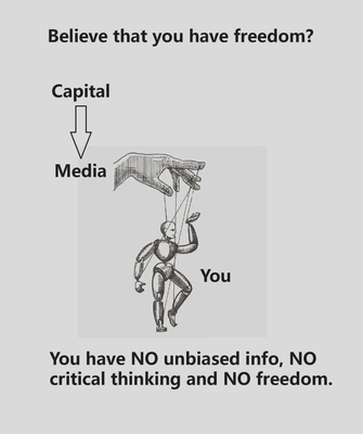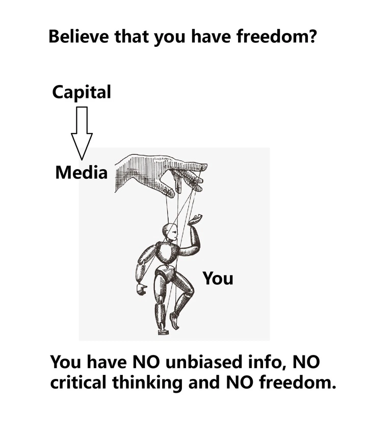 这个媒体系统,可以是新闻媒体,可以是电视节目,可以是网络上的各种来路不明的大V网红,更广义的媒体系统也可以包括各种电视剧、电影、小说、动漫、游戏。大多数平民都是懒于思考的,媒体系统说什么,他们往往就盲从。久而久之,他们失去了自己的意志,都成了媒体系统的提线木偶。